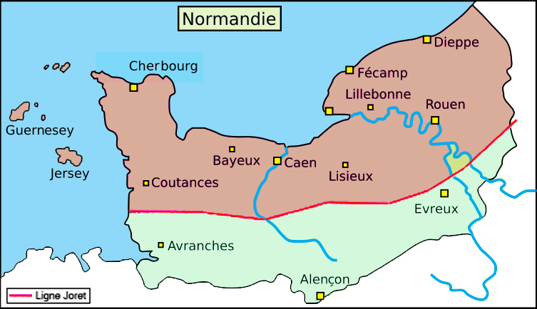 Named after the French historian and linguist Charles Joret, the Joret line is an isogloss that runs through northern France and Belgium (specifically through Normandy, Picardy and into Wallonia). Now, bearing in mind the inherent inaccuracy of attempts to pin down the location of linguistic features, and for the effects of French standardisation and modern social mobility, the part of the Joret line in Normandy looks so: