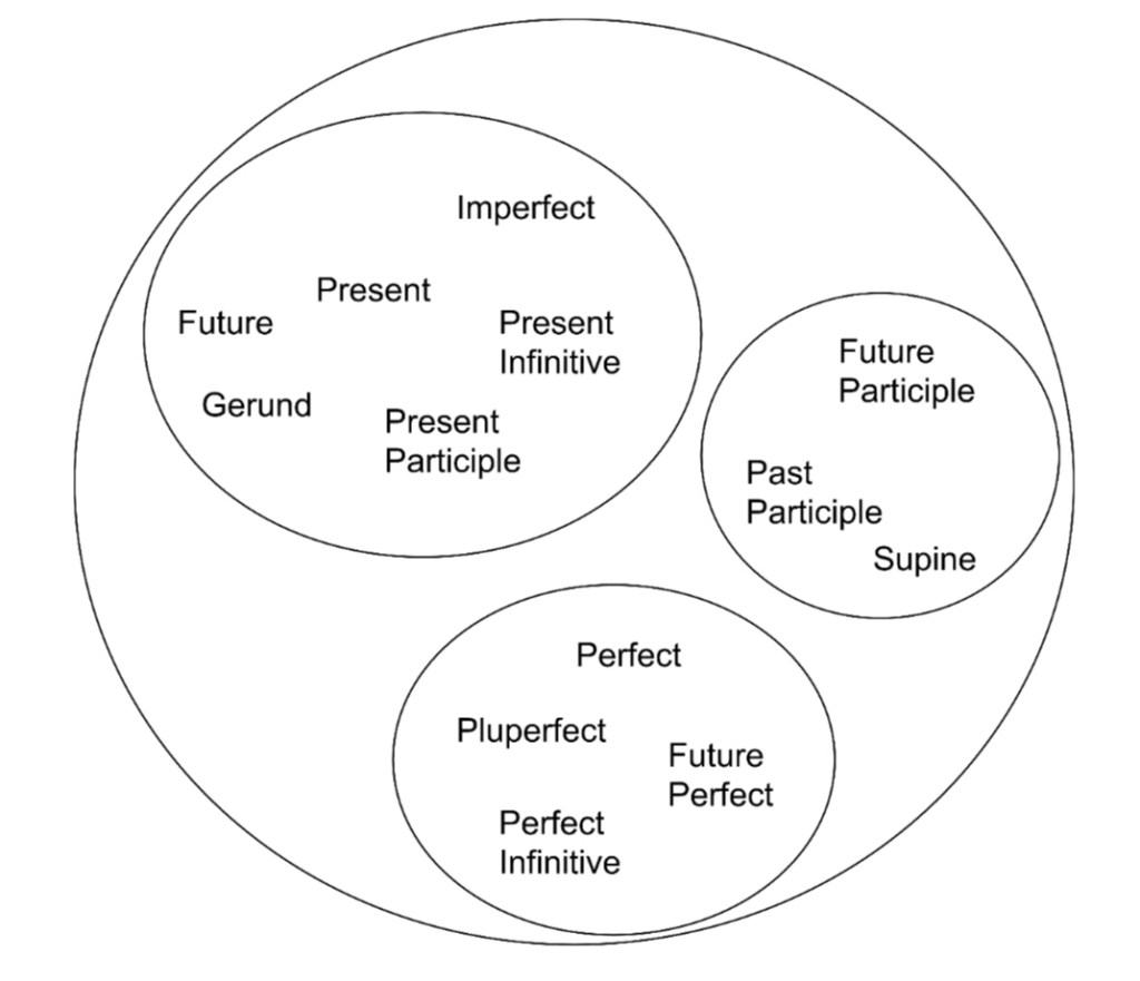 The way to understand this system of changing stems is to first imagine all Latin tenses together in one big set. These include not only what we normally think of as ‘tenses’ (e.g. present, future, imperfect, perfect), but other verb forms too, like infinitives and participles. Such a set would look something like this: