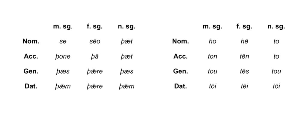 Understanding these changes to *s reveals wonderful connections between Greek and Old English, a language that is distantly related to Greek and that retains the inherited [s] sound. Not only do both languages make use of a definite article (that is, the), the words used for it come from the same prehistoric origin. Compare the singular forms for the definite article in Old English (on the left) and Ancient Greek (on the right), organised according to gender (masculine, feminine, neuter) and case.