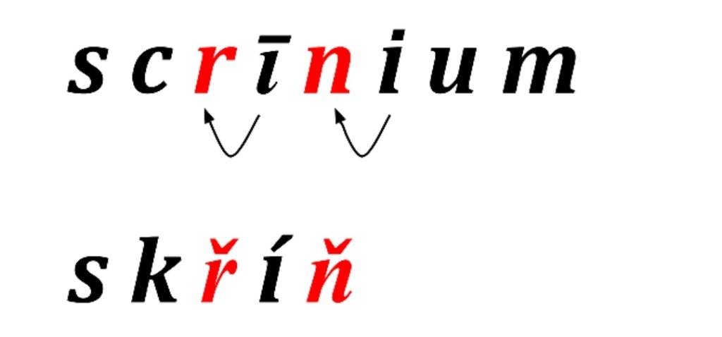 We can now also understand the history of some loanwords in Czech. At an early point in time, Slavic languages borrowed the Latin word scrīnium, meaning ‘case’ or ‘box’. Being an old borrowing, scrīnium arrived in time to go through the process of palatalization. The two /i/ vowels affected the /r/ and the /n/ of the Latin original. What we expect is what we get: scrīnium became Czech skříň.