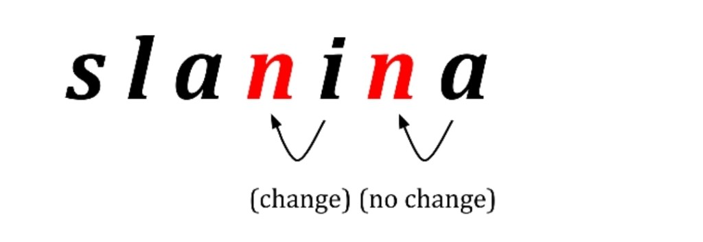 For example, the nasal consonant /n/ (as in English nose), when used in a word before /i/ or /j/, shifted backwards to become the palatal nasal /ɲ/. Take the Czech word slanina, meaning ‘bacon’. The two N’s in slanina are not pronounced the same. This is due to the vowel that follows each. The front vowel /i/ has palatalized the first into /ɲ/, while the vowel /a/ had no such effect on the second.