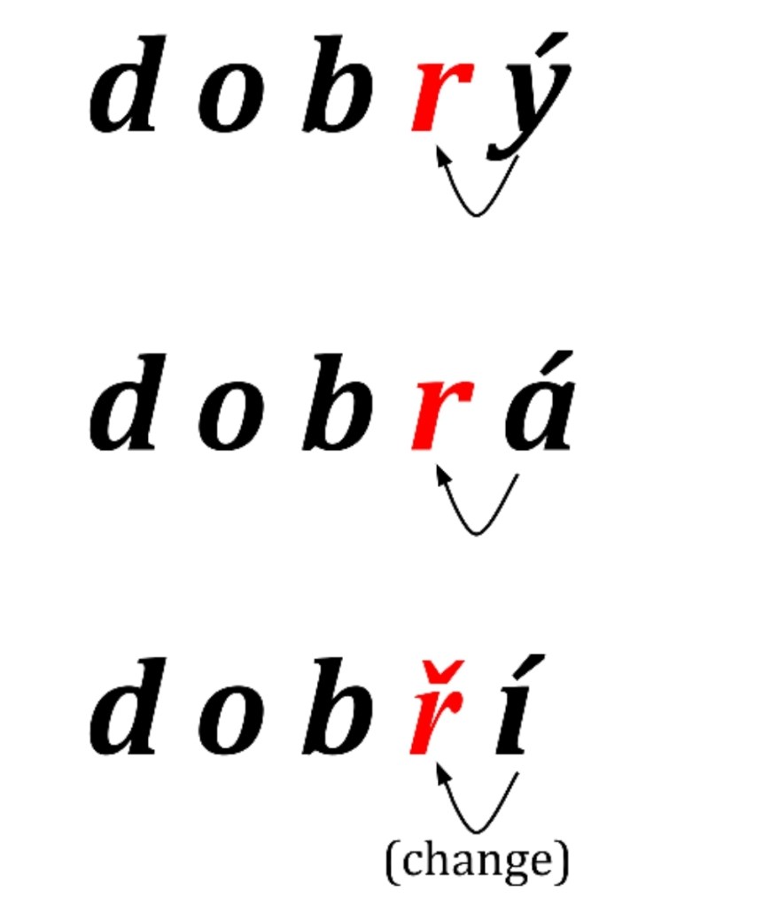 What though about the masculine plural ending -í? Add -í to dobr- and we get dobří. The vowel changes the original R into the more palatal sound Ř.