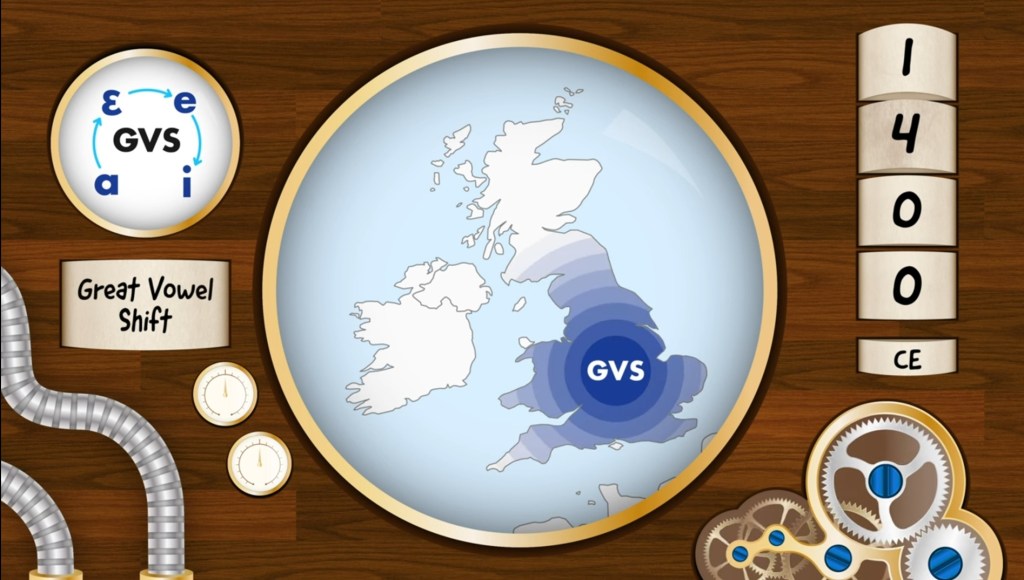 Travelling back in time with the Timescope to see the radiating reach of the Great Vowel Shift!