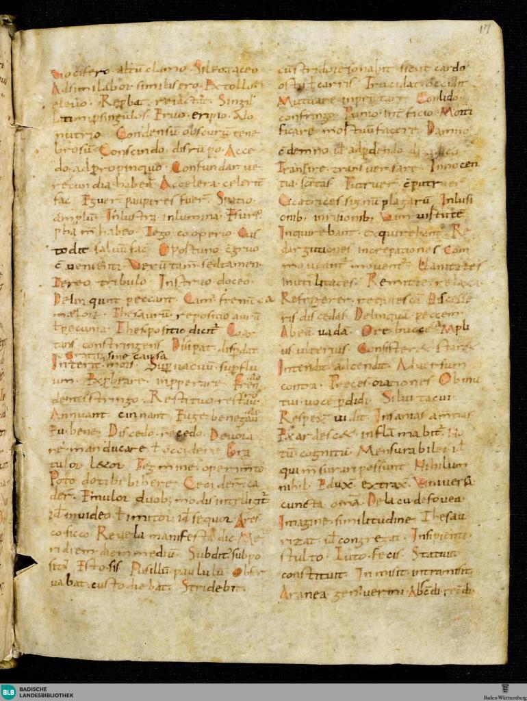 The Reichenau Glossary is one text though that tells us a great deal about when certain features of the Romance languages had arisen, and how far the Late Latin language had diverged from its older, classical standard by the time it was composed. As the name suggests, it’s several long lists of words, compiled in the 8th century AD, and found in 1863 among the library of the German abbey of Reichenau. The glosses are principally written in the manuscript Karlsruhe 115, housed today in the Badische Landesbibliothek. The language of the text is Latin, and the purpose of the glosses is to explain and provide synonyms for words used in St Jerome’s 4th/5th-century Latin translation of the Bible, known as the Vulgate. One part goes through tricky words in the Bible book by book, another part glosses words alphabetically.